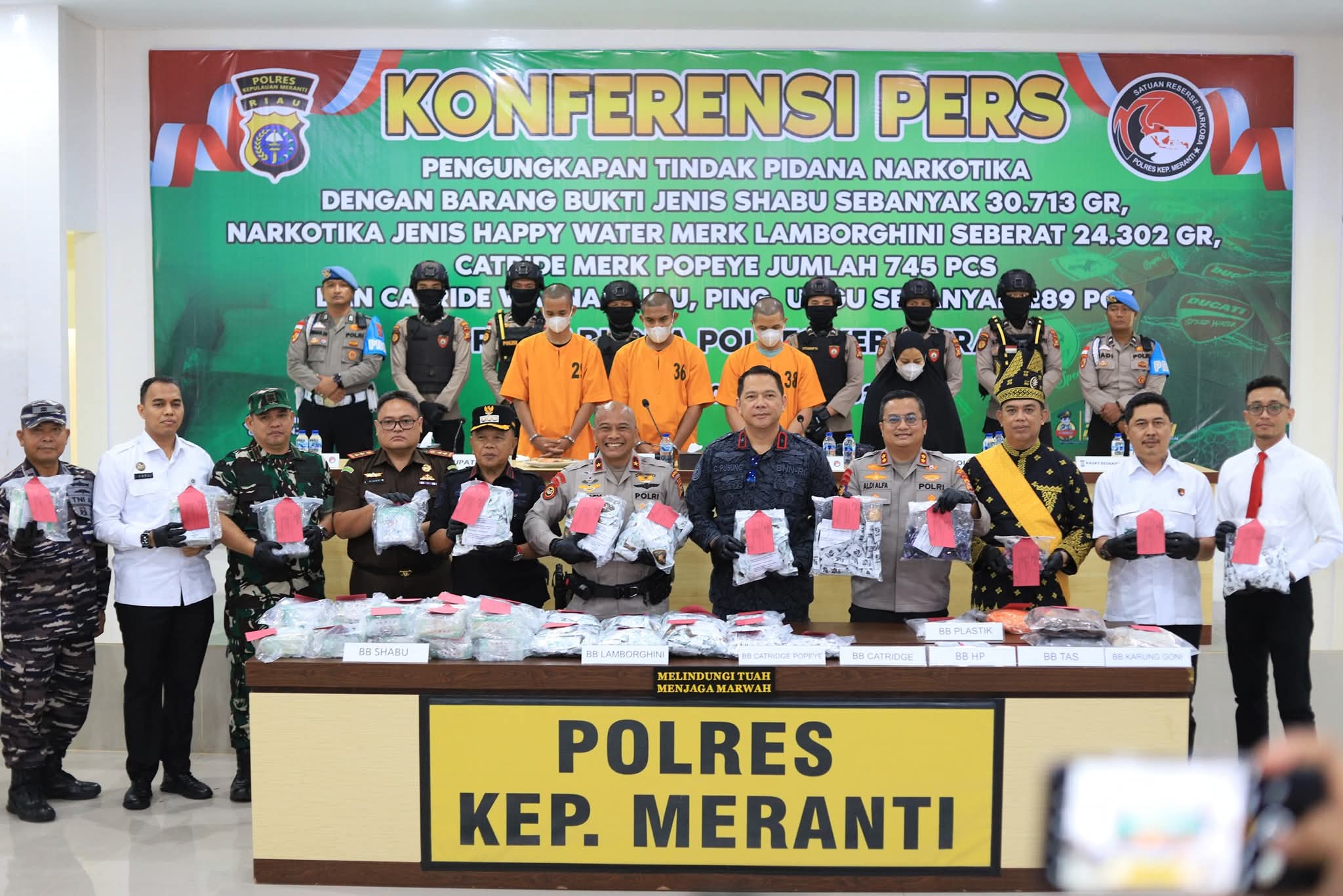 Konferensi pers atas keberhasilan tersebut digelar di Mapolres Kepulauan Meranti, Kamis 9 Oktober 2025, dihadiri langsung oleh Kepala Badan Narkotika Nasional Provinsi (BNNP) Riau, Brigjen Christ Reinhard Pusung, Wakapolda Riau, Brigjen Jossy, Kapolres Kepulauan Meranti, AKBP Aldi Alfa Faroqi, dan sejumlah pejabat kepolisian dan juga Pemkab Kepulauan Meranti.