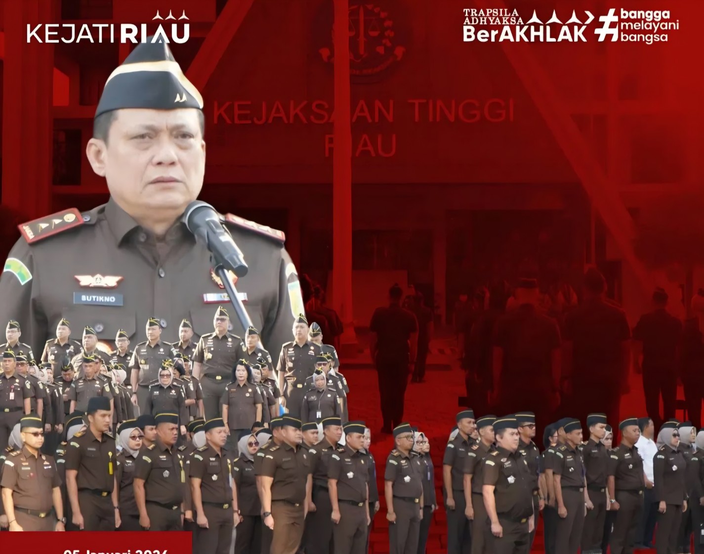 Penegasan ini disampaikan Kajati Riau, Dr Sutikno, saat memimpin apel kerja yang diikuti para Asisten serta seluruh pegawai di halaman kantor Kejati Riau, Senin 5 Januari 2026. Apel ini menjadi sarana penyampaian arahan strategis sekaligus penguatan komitmen kerja di awal tahun 2026.