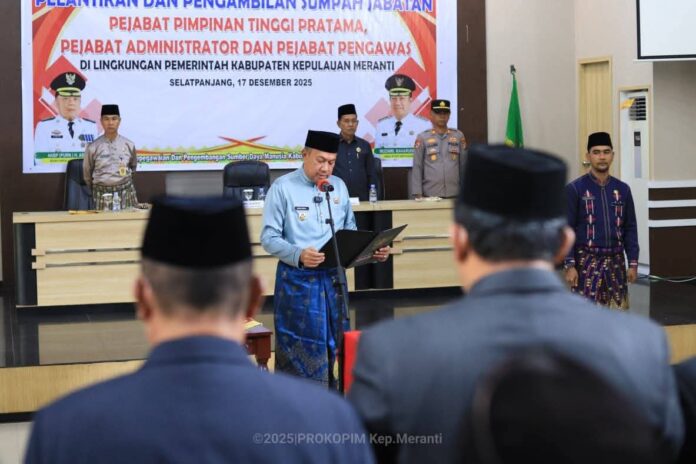 MERANTI (TRANSMEDIA.CO)– Wakil Bupati Kepulauan Meranti, Muzamil Baharudin, SM, MM, melantik 24 pejabat di lingkungan Pemerintah Kabupaten Kepulauan Meranti, Rabu 17 Desember 2025, di Aula Kantor Bupati Selatpanjang.